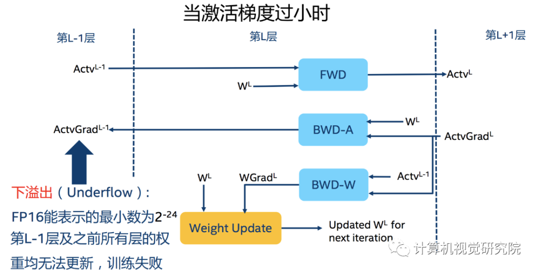 解决问题的办法:混合精度训练+动态损失放大 混合精度训练的精髓在于“在内存中用FP16做储存和乘法从而加速计算,用FP32做累加避免舍入误差”。混合精度训练的策略有效地缓解了舍入误差的问题。 即使用了混合精度训练,还是会存在无法收敛的情况,原因是激活梯度的值太小,造成了下溢出(Underflow)。损失放大的思路是: 反向传播前,将损失变化(dLoss)手动增大2^k倍,因此反向传播时得到的中间变量(激活函数梯度)则不会溢出; Apex的新API:Automatic Mixed Precision (AMP)