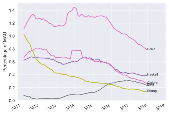 文中作者还对用于科学领域的语言进行了分析,详情可查看原文。作者还表示未来对编程语言流行度的跟踪将会参考其他一些数据,如 TIOBE 指数、Stack Overflow 上的标签趋势图、GitHub Octoverse 等。
