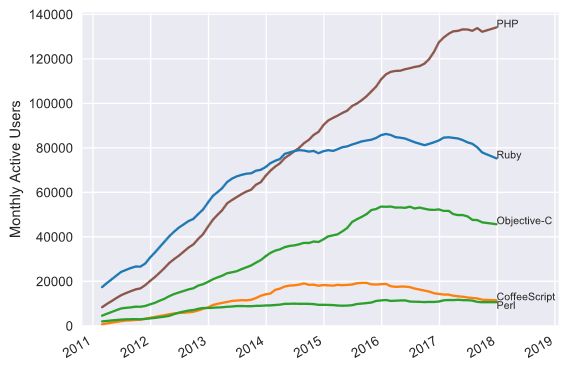 这样来看,相比 2011 年,使用 Ruby 语言的活跃用户数量已经超过了3倍。它的增长没有其他语言那么快,导致它在这个分析上的表现相对较差。
