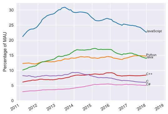 首先,作者表示这次分析的数据主要来源于 GitHub Archive 和 GHTorrent。他通过分析 GitHub Archive 上 7500w+ 个不同的仓库中超过 12.5 亿次的事件(包括推送新代码、fork、star、issue 处理等),每月汇总一次,计算了每种语言的 MAU(月活跃用户数量),详细的分析说明可点此查看。