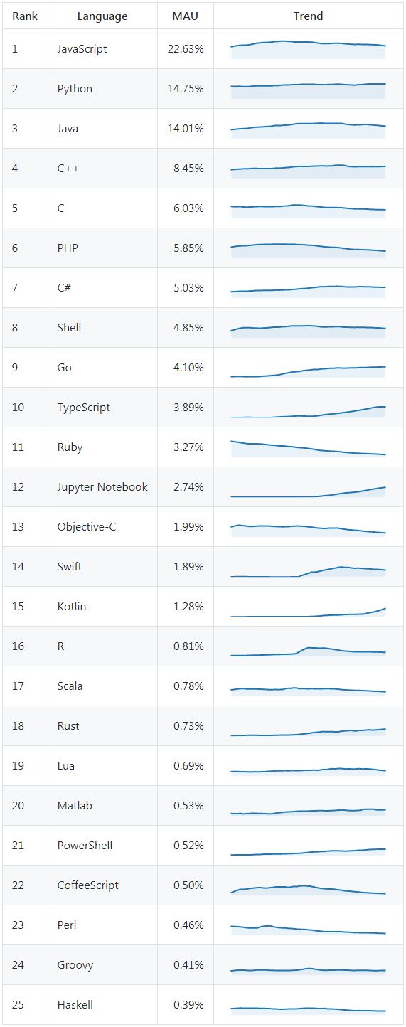 先看看总体数据,截至 2018 年 1 月 24 日,通过统计 GitHub 上活跃用户的活动情况,对每种语言的排名结果如下(TOP 25):