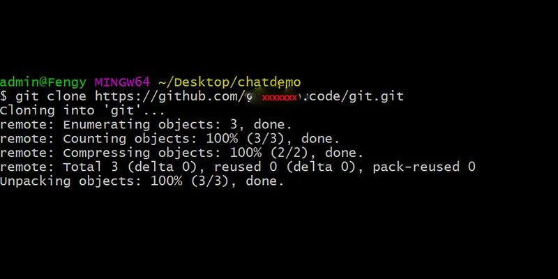 然后我们在桌面创建一个 chatdemo 文件夹,以 git bash 终端打开,输入 git clone 仓库的URL 下载远程仓库到本地,即 git clone https://github.com/xxxcode/git.git: