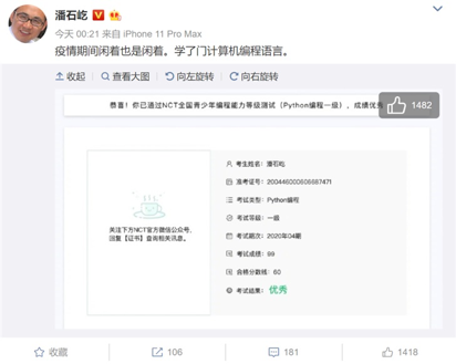 半年过去了,今天凌晨,潘石屹在微博晒出了自己的第一张Python考试成绩单,“通过NTC全国青少年编程能力等级测试(Python编程一段)”,还取得了99分的优秀成绩!截止到发稿,这条微博已经得到了1400多赞。
