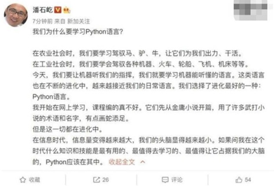 还记得去年11月15日的时候,年过半百的SOHO中国董事长潘石屹突然在微博上宣布,要正式开始学习Python,并表示,“Python是进化最好的一种语言”。