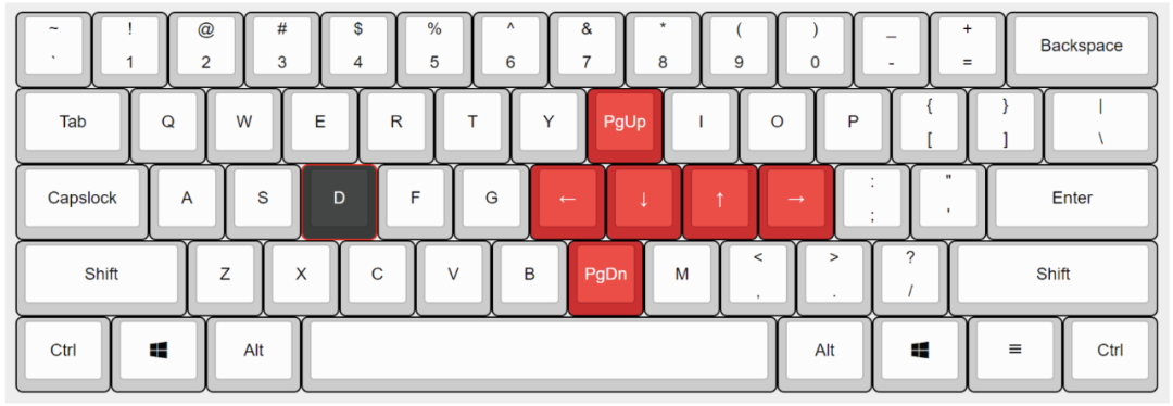 由于使用了 Python 编写键位映射,我们可以很方便地对键位进行个性化定制「以后谁还需要宏编程键盘,大雾」。该项目自带 Tap-key 功能,即按住一个键不放可激活替代功能模式,在 60% 键盘上扩展出更多键位。我们只需将 keyboard.py 与 keycodes.py 复制到 CIRCUITPY 目录下,之后修改 code.py 导入新键盘,即可将按键 D 用作导航。当仅想要输出 D 时快速敲击即可,而按住 D 不放则激活导航功能,变化后的键位如下图所示。
