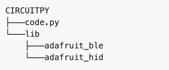 第二步是对上图中红色设备的编程。作者在 Github 中编写了详细的指南,对 Pitaya Go 进行编程并烧写到 Flash CircuitPython 固件上。接下来,下载两个 CircuitPython 库:adafruit-ble 和 adafruit-hid,并将它们放入名为 CIRCUITPY 的 USB 驱动器里的 lib 目录中,如下图所示。