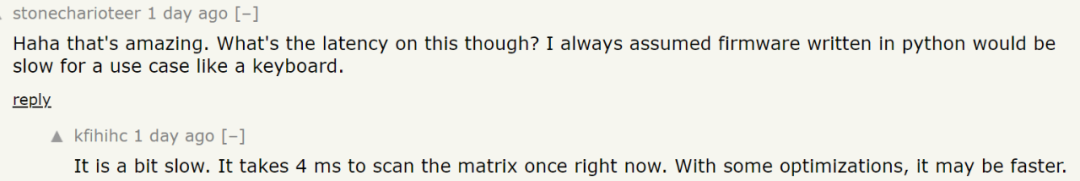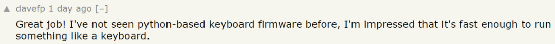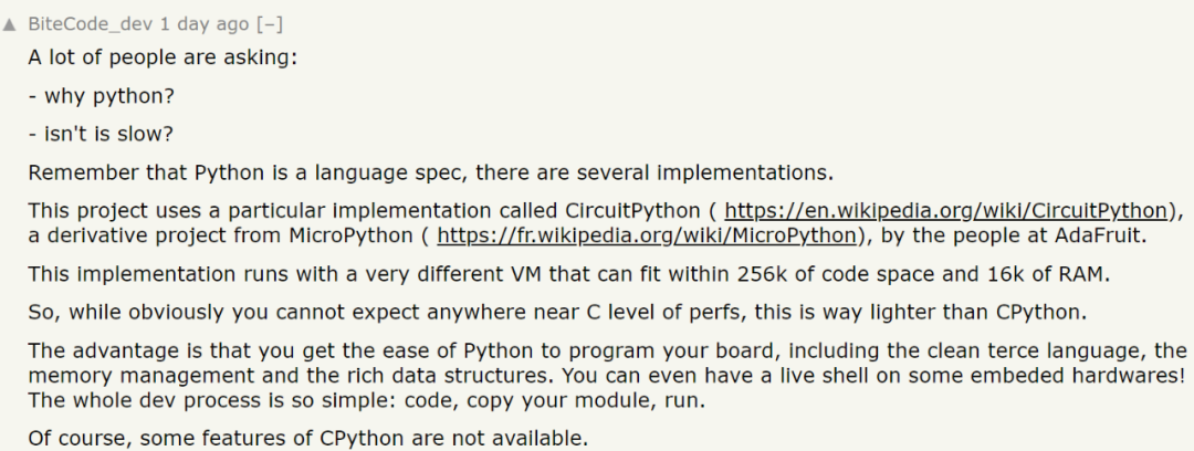 除此之外,也有人帮作者补充了使用 Python 的好处。ta 指出,这个项目用到的 CircuitPython 实现使用一个非常不同的 VM 运行,虽然不能指望它接近 C 的性能,但相比 Cpython 要轻量化得多。整个开发过程也会简单得多。
