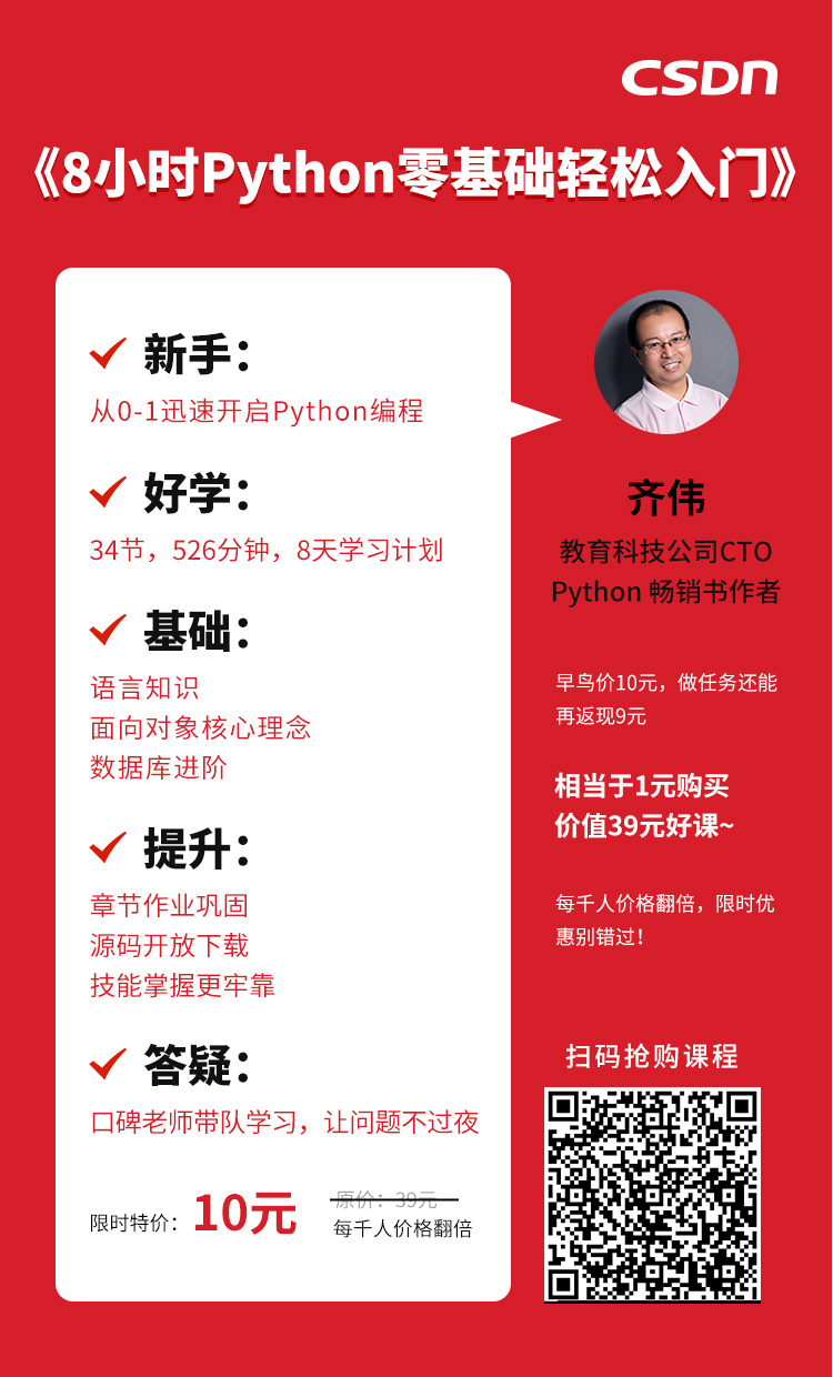 本门课程的核心讲师,是Python畅销书作者,科技公司CTO齐伟老师。作为一个有着多年技术经验,已出版《跟老齐学Python》系列畅销书。在这门课程中,齐老师深入浅出,毫无保留的分享他的经验知识。讲课风格幽默诙谐,通俗易懂,带给学员们愉快的Python入门体验。