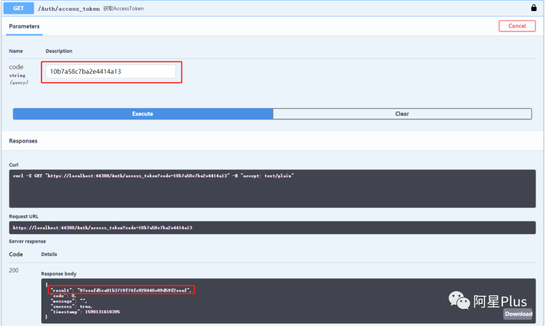 然后拿到code(10b7a58c7ba2e4414a14),在去调用一下获取AccessToken接口,成功返回我们的access_token(97eeafd5ca01b3719f74fc928440c89d59f2eeag)。