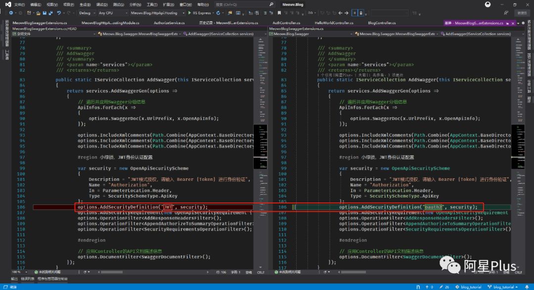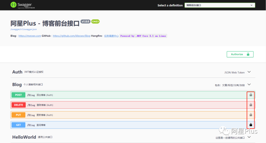 当想要保护某个接口时,只需要加上Attribute:[Authorize]就可以了。现在来保护我们的BlogController下非查询接口,给增删改添加上[Authorize],注意引用命名空间Microsoft.AspNetCore.Authorization。