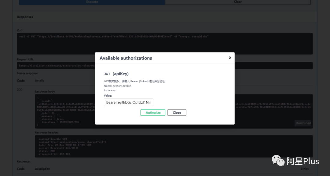 如果需要在Swagger中调用我们的非公开API,要怎么做呢?点击我们的小绿锁将生成的token按照Bearer {Token}的方式填进去即可。