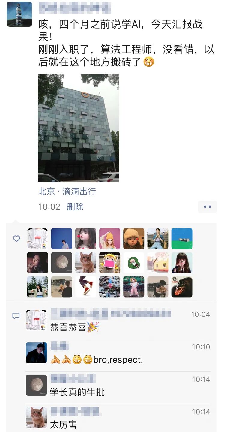 他本科是学物理的,研究生考进了华科大的统计学,毕业后做了一年的python开发,今年初开始学4个多月AI,然后顺利拿到滴滴 Offer。
