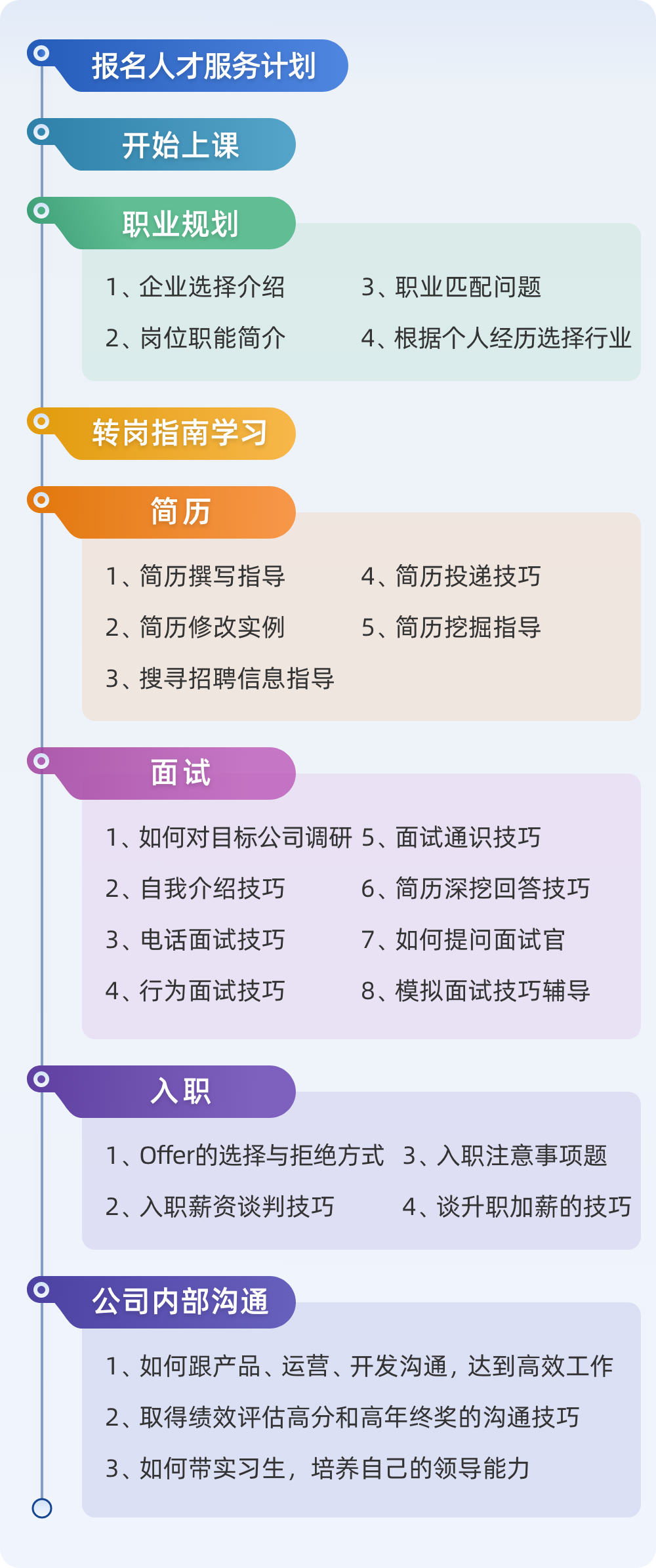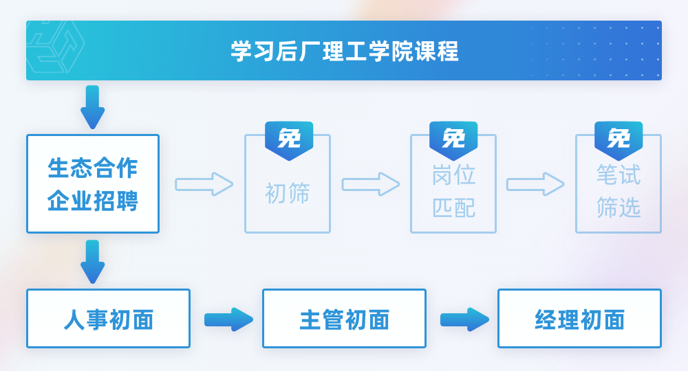 后厂理工学院全新打造就业服务课程,聚焦提升就业软实力;从准备到入职,给你跳槽-面试-拿offer-入职干货技巧性指导;并且提供30+就业服务课和专业强化技能课,提升你的职场核心竞争力。