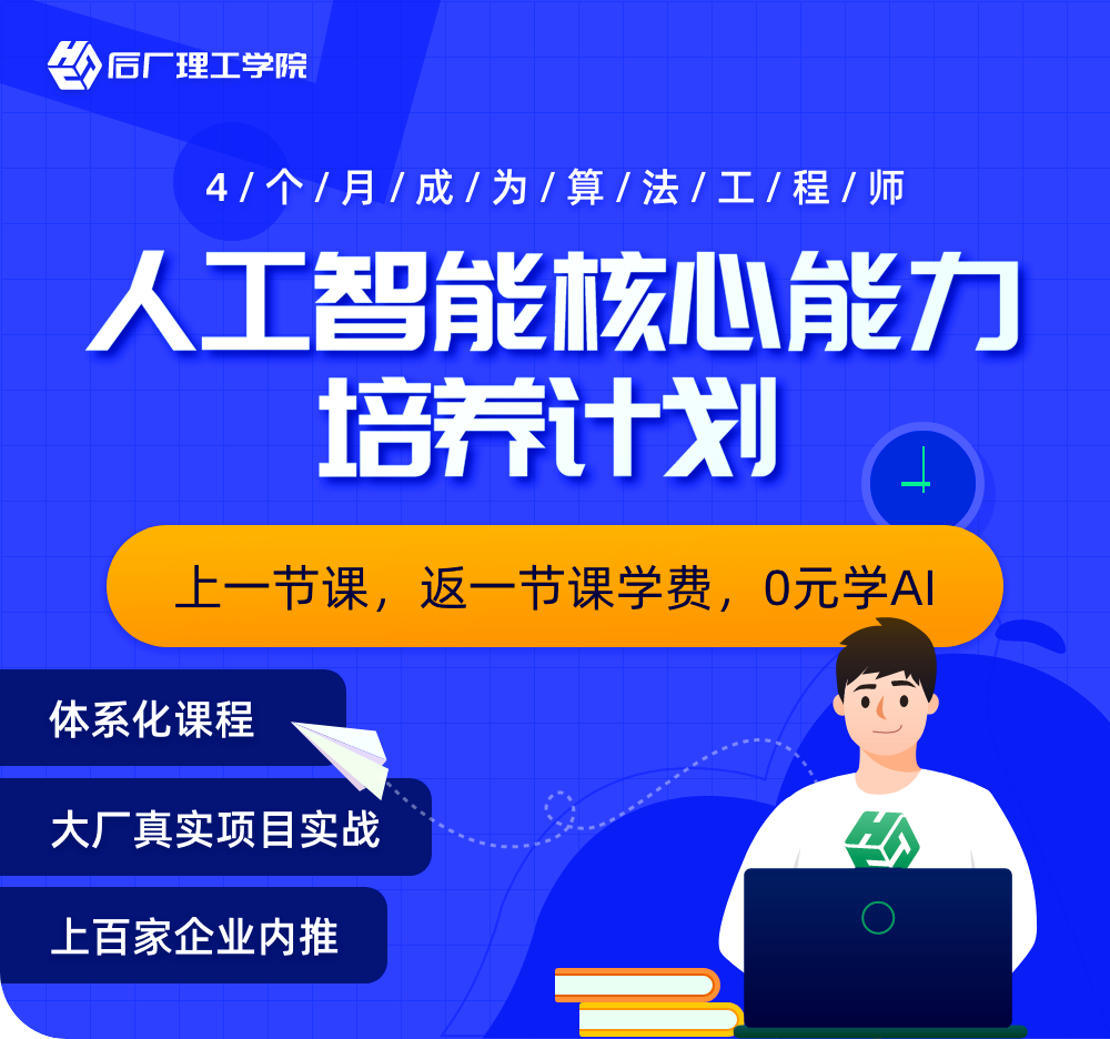 跟着后厂理工学院的《人工智能核心能力培养计划》,我们会把你培养成为具有实战能力的高阶工程师。