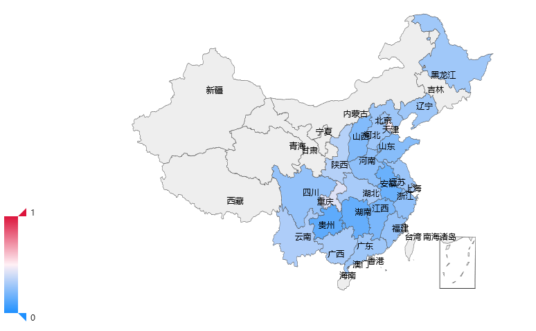 当然也可以统计下各个地区网友的情感指数,然后绘制情感地图。蓝色代表负向,红色代表正向,可以看到各地区都是偏向负向的,其中贵州、湖南、安徽负向更明显一点。有的地方呈灰色,是因为参与评论的网友样本量太少,就直接过滤掉不显示了。