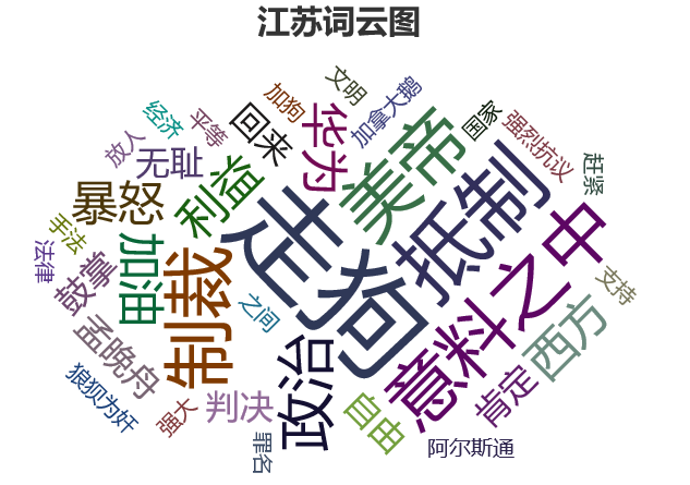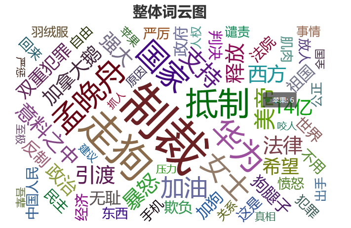 这张词云图TOP15关键词依次为:制裁、走狗、抵制、华为、孟晚舟、国家、女士、加油、支持、美帝、暴怒、引渡、释放、意料之中、法律。