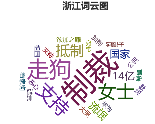TOP15关键词依次为:制裁、走狗、支持、女士、抵制、14亿、国家、流氓、欲加之罪、祖国、希望、谴责、看家狗、加狗、华为