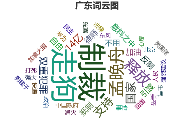 TOP15关键词依次为:制裁、走狗、孟晚舟、释放、支持、国家、双重犯罪、14亿、自由、意料之中、引渡、加油、律师、反制、抵制。