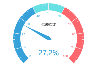 所有评论的情感指数为27.2%,整体情感倾向是负向的。40%以下为负向(蓝色),40%~60%为中性(绿色),60%以上为正向(红色)。