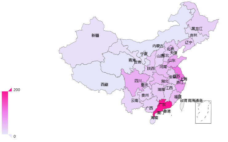 通过这张地图可以得知评论网友来自地区TOP3的为广东、江苏、浙江。