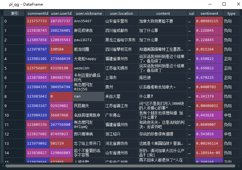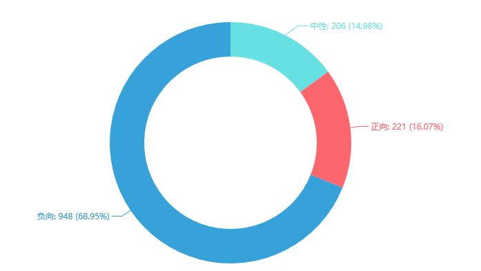 可以看到统计结果,负向共948条评论,占了所有评论的约69%。