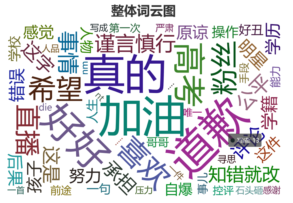 这张词云图TOP20关键词依次为:加油、道歉、真的、好好、高考、喜欢、希望、粉丝、直播、事情、谨言慎行、公平、承担、评论、这是、这字、知错就改、学籍、错误、明星。