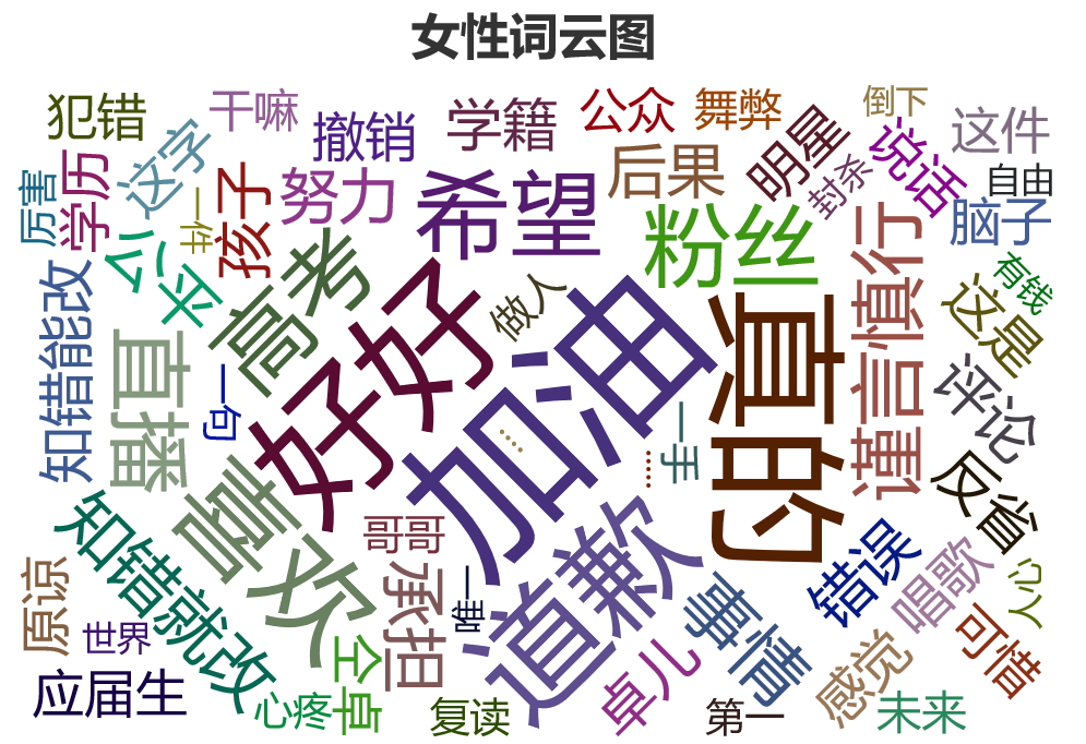 可以看到女性网友正向关键词更多:加油、好好、希望、喜欢、知错就改、谨言慎行等。