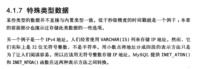 正如在《高性能MySQL 第3版》第4.1.7节时,作者建议当存储IPv4地址时,应该使用32位的无符号整数(UNSIGNED INT)来存储IP地址,而不是使用字符串的原理一样。