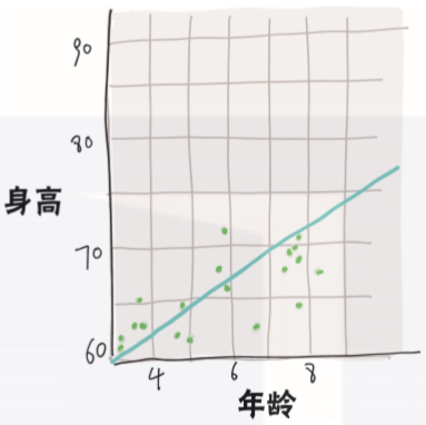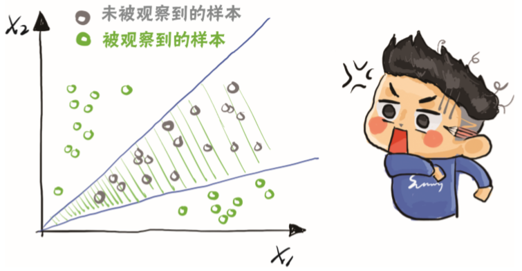 (用户A,{年龄:29,身高:185,年收入:70,婚姻状况:未婚,状态:逾期})(用户B,{年龄:24,身高:167,年收入:31,婚姻状况:已婚,状态:未逾期})(用户C,{年龄:46,身高:177,年收入:50,婚姻状况:离异,状态:未逾期})其中每一个用户及其属性对称为一个样本(或观测)。这样的一系列用户及其自身的属性构成了样本集,其中用户“A”“B”“C”构成了样本空间,“特征年龄”“身高”“年收入”“婚姻状况”构成了特征空间。此外还有一个空间叫作参数空间,即由组成预测函数的参数的所有取值所组成的空间。“状态”这个字段则代表着样本的标签,也就是需要模型来判别的结果。这个例子中特征空间有4个取值:年龄、身高、年收入、婚姻状况。这4个取值就代表着特征空间中的4个维度,或者说这个特征空间的维度是4。在良好的假设条件下,模型期望每个特征之间互不干扰,然而在实际情况下,通常每个特征之间都有可能存在关系。比如我们可以将其中两个维度(年龄和身高)画出来。当处于低龄时(即0~8岁),我们可以明显地观察到身高的取值随着年龄增长也在不断地变大,如图3-1所示。婚姻状况这个特征可能取值为{未婚、已婚、离异},那么这3个取值就限制住了特征空间在婚姻状况这个维度上的取值。如果数据中只有{未婚、离异}这2种取值的样本,则称这个数据集不能完整表征它所在的样本空间,即在它的某一特征维度上,有一些值没有被观测到,不能很好地观察到这个维度特征的真实分布。通过已观察的样本点,只能表征出阴影部分的空间,如图3-2所示。