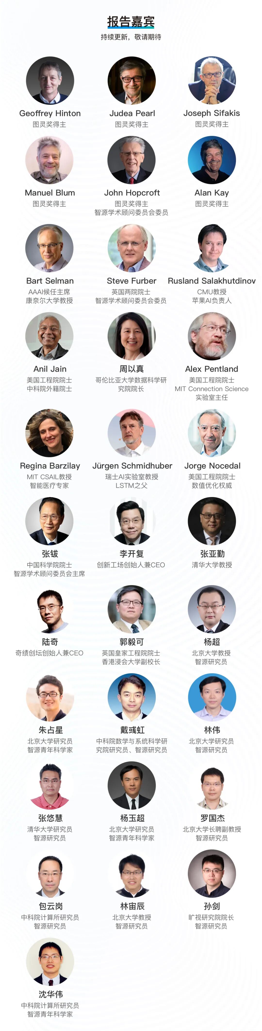 与会嘉宾不仅有Geoffrey Hinton、 Alan Kay、Judea Pearl等6 位来自美国、加拿大和法国的图灵奖得主。在 Guide2Research2020 「Top 10 计算机科学家」榜单中排名第一位的 Anil Jain 也将来到本次大会。大会还邀请到了人工智能各领域多位世界级的专家,还有多位大名鼎鼎的国内学术界和产业界领袖,为大家带来精彩的分享。