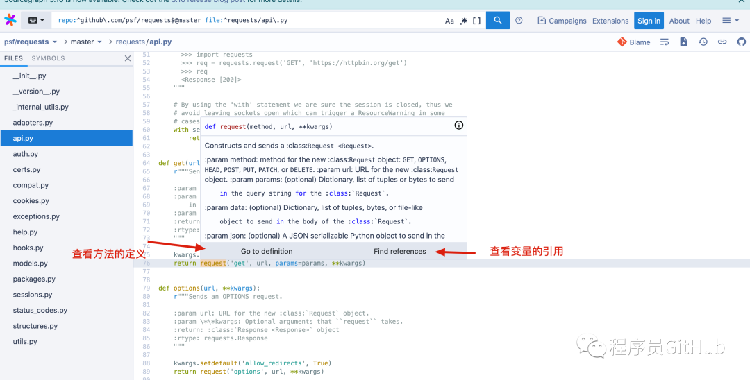 使用 GitHub 原生页面浏览代码时想看一下某个变量的引用情况或者一些方法的定义很不方便,Sourcegraph 可以解决上面遇到的问题。这个插件安装完成后,随便打开一个 GitHub 项目,会发现多了一个新图标,这样的: