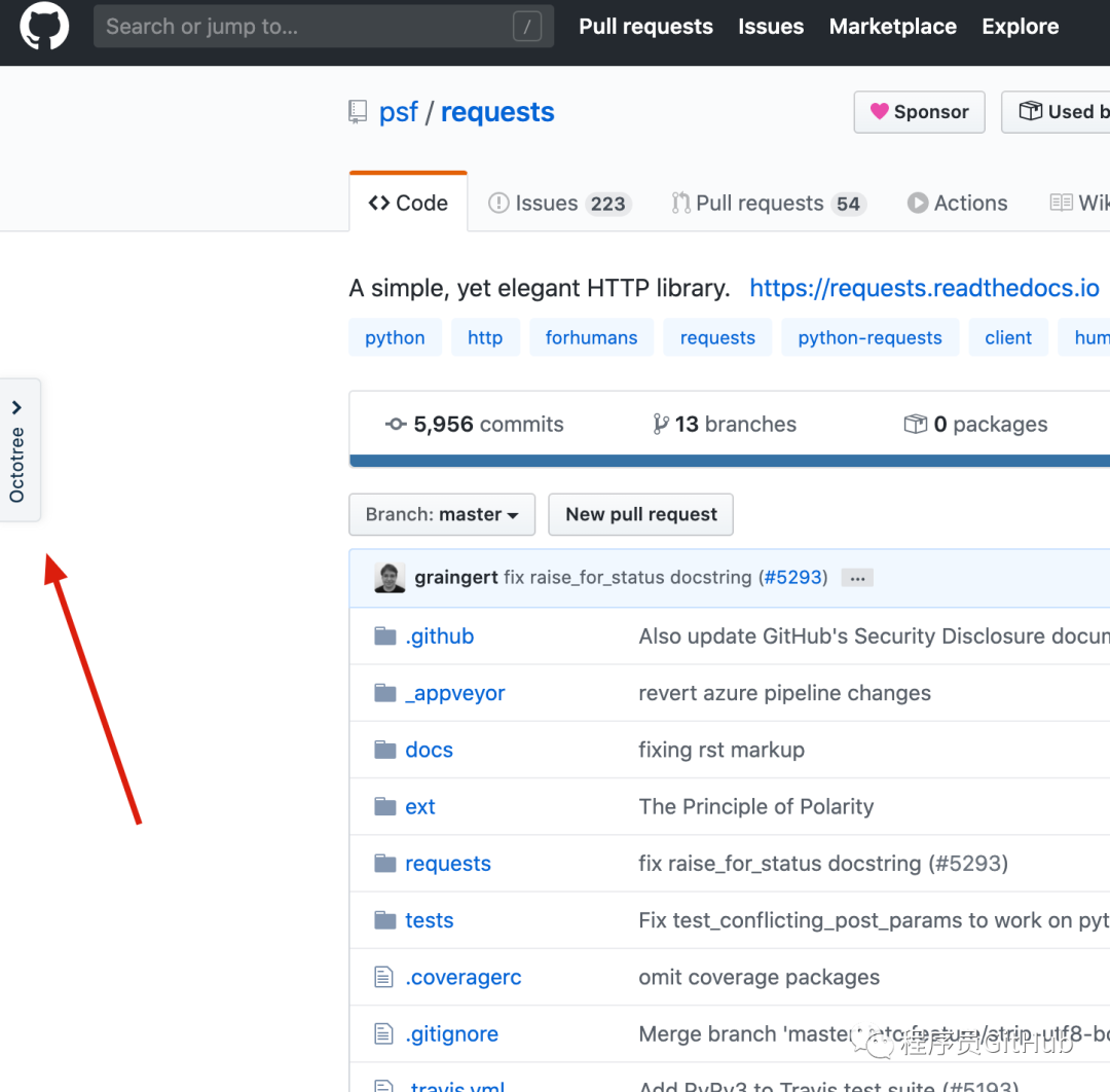 Octotree 插件就很好的解决了上面的问题,当你安装好这个插件后,浏览 GitHub 上某个项目的代码时,左侧会有个按钮,如下图: