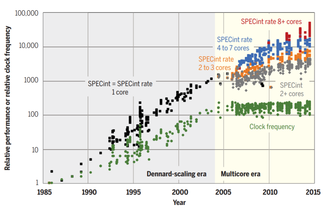 在讨论硬件架构之前,我们先来谈谈「Dennard 缩放比例定律」。Dennard 缩放比例定律是一个鲜为人知但同样重要的观察结果,Robert Dennard 在 1974 年提出,随着晶体管变得越来越小,它们的功率密度保持不变,因此功率的使用与面积成比例;电压和电流的规模与长度成比例。结合「摩尔定律」晶体管的数量大约每两年翻一番,这意味着效能功耗比(每消耗一瓦功率,计算机可提供的计算速率)以同样的速度增长,大约每两年翻一番。Dennard 缩放比例定律在提出之后的 30 年后结束,原因并不是因为晶体管的尺寸不再缩小,而是因为电流和电压不能在继续下降的同时保持可靠性了。随后「多核时代」就到来了。