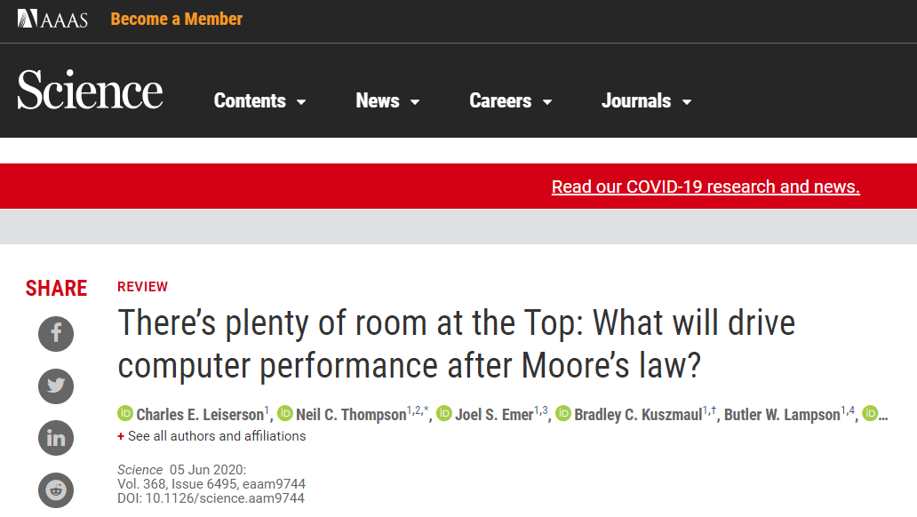 算力的提升可以为现代生活带来诸多便利,例如,当前手机的功能比 25 年前房间大小的计算机都要强大,近一半的人可以上网,强大的超级计算机还可以用于药物挖掘。人类社会已经了开始依赖计算机随时间指数增长的强大性能了。计算机性能的提高大部分要归功于数十年来计算机部件的小型化。诺贝尔物理学奖获得者理查德 · 费曼早就预见了这一点。在 1959 年致美国物理学会的演讲中,他提到,「底部还有大量空间」。1975 年,英特尔创始人戈登 · 摩尔给出了这种部件小型化趋势的预测,即集成电路上可容纳的元器件数目约每隔 18-24 个月便会增加一倍,性能也将提升一倍。我们将其称之为摩尔定律。不幸的是,这种趋势正在走向消亡,因为「底部」已经没有多少空间了。如果算力的提升停滞不前,那么几乎所有行业的生产力都将面临挑战。在此背景下,MIT、英伟达、微软的研究者在最新一期《Science》上发文指出,虽然「底部」已经没有太多提升的空间,但「顶部」还有机会:在软件、算法以及硬件架构方面,我们都能够找到提升计算性能的方法。