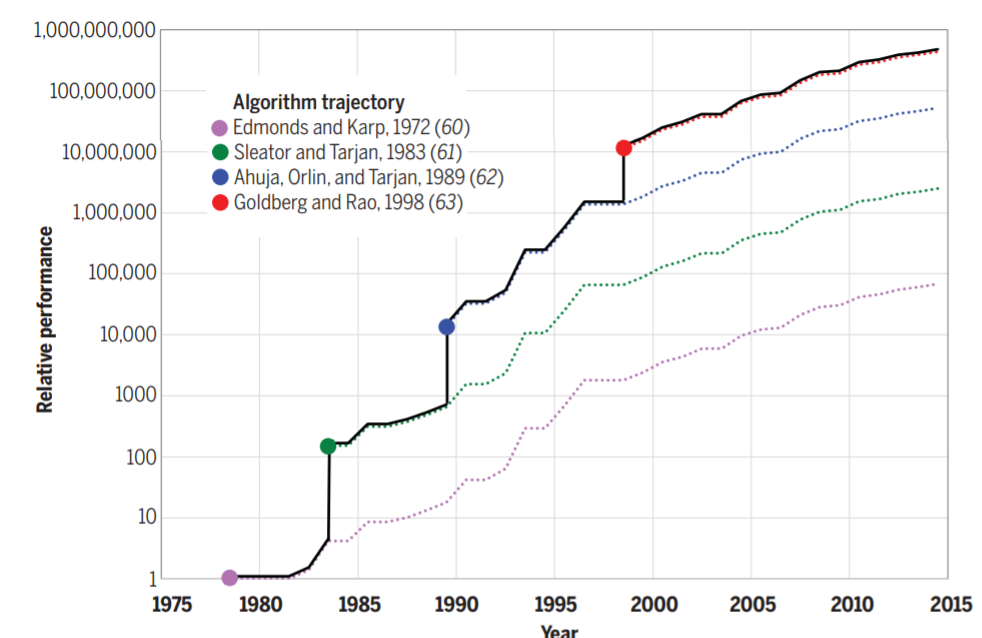 图 1 展示了最大流算法随时间的进展。在 38 年的数据中,最佳算法的性能收益可与摩尔定律所带来的收益相媲美,尽管过去 20 年,在该问题上并没有提升性能的新算法出现。该例子重点介绍了有关算法的 3 个重要观测结果: