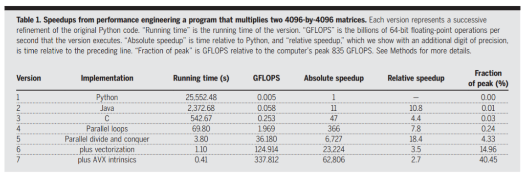 论文链接:https://science.sciencemag.org/content/368/6495/eaam9744我们可以通过性能工程(performance engineering)把软件做得更加高效,即通过重构软件加快其运行速度。性能工程能够消除程序中的效率低下问题,这种问题被称为软件膨胀(software bloat),是由传统软件的开发策略造成的,即尽可能缩短软件开发时间而不是缩短软件运行时间。性能工程还可以根据运行的硬件来定制软件,如利用并行处理器和矢量单元。为了说明性能工程的潜在收益,我们思考一个简单的问题:将两个 4096×4096 的矩阵相乘。首先用 Python 代码实现,代码在一台现代计算机上做该矩阵乘法需要 7 个小时,如表 1 中的第一行(Version 1)所示,仅达到机器峰值性能的 0.0006%。