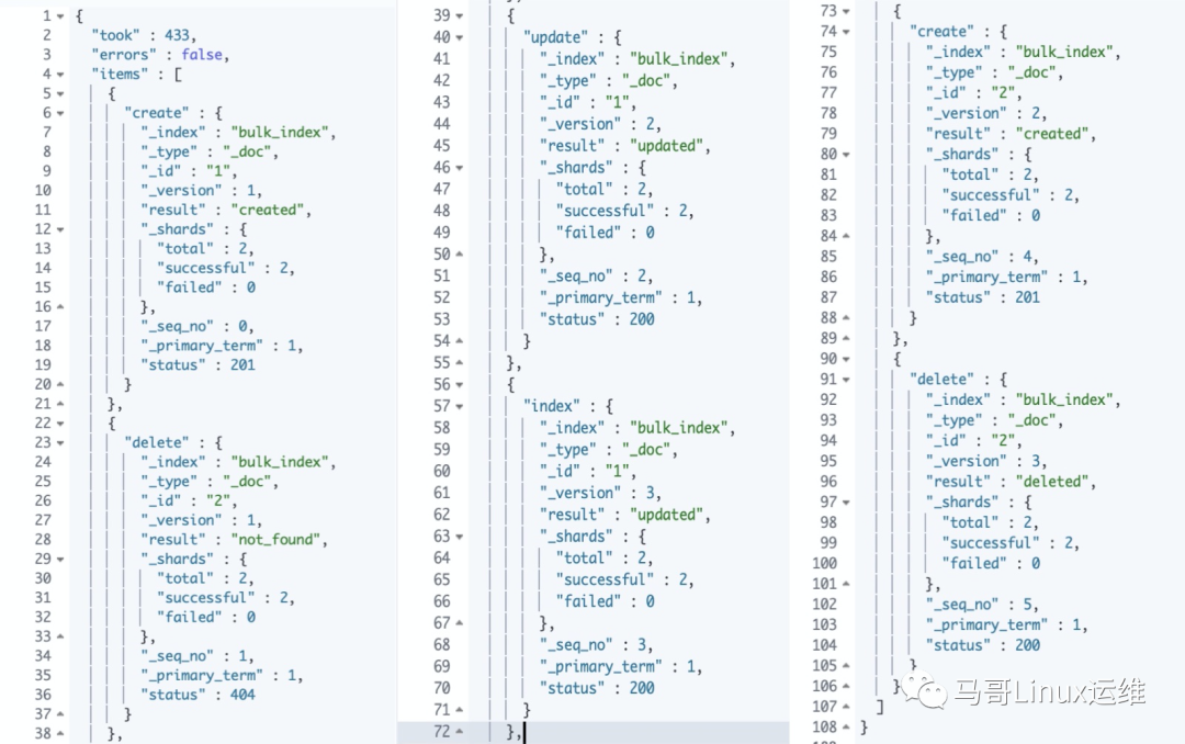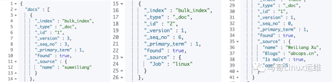 GET _mget{"docs":[//docs为mget格式{"_index":"bulk_index",//指定要读取文档的索引"_id":1//指定读取文档的ID},{"_index":"bulk_index",//同一索引内的不同ID联合读取"_id":2},{"_index":"index",//不同索引中的不同ID联合读取"_id":1}]}