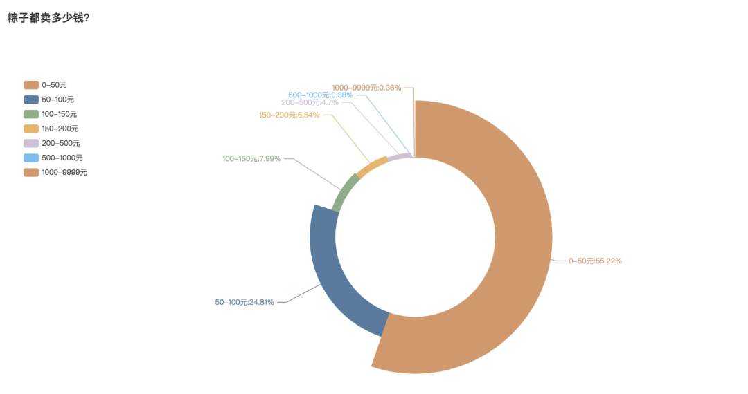 可以看到50-100元的粽子销售额最高,占比53.61%。其次是50元以内的,占比22.06%。毕竟从送礼品的角度,还是要一定价格考量的,太平价的不行,需要一定的档次。