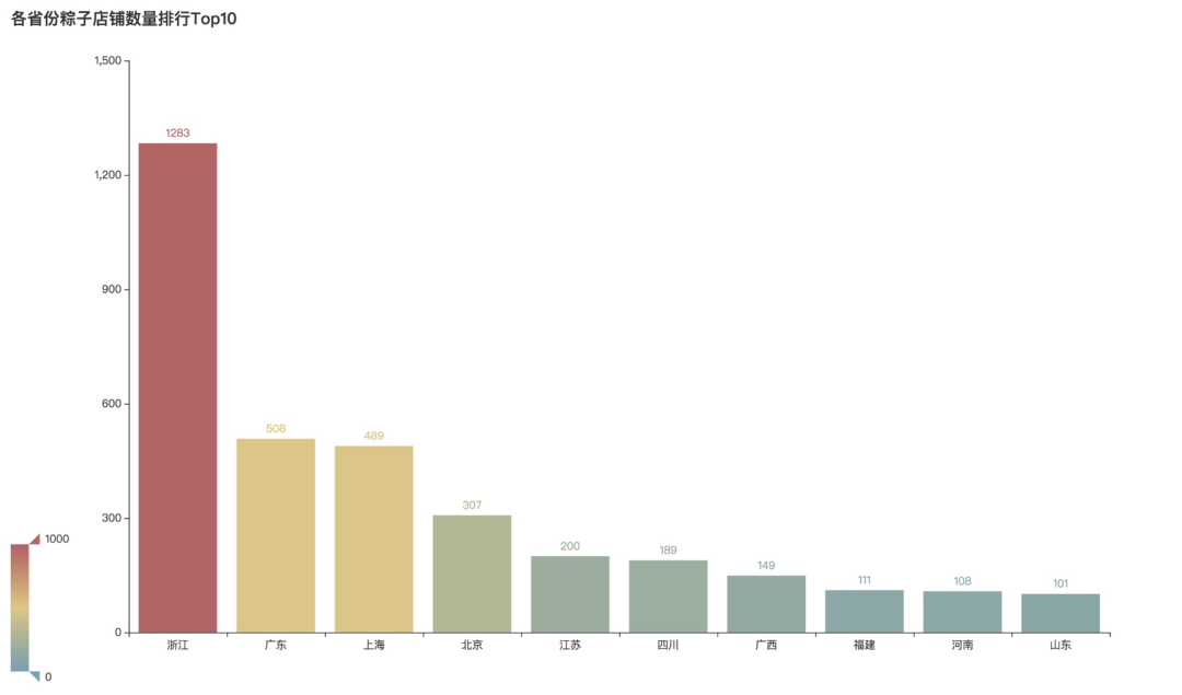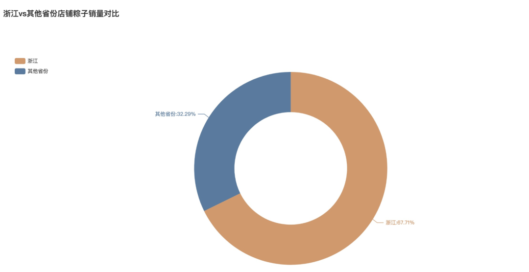 经过分析发现,浙江一骑绝尘,粽子店铺数量远远领先其他省份。浙江的粽子店铺占到全网的67.71%。毫无争议的大佬。