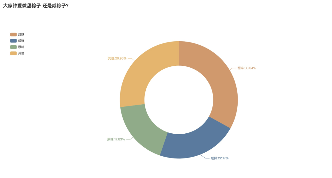 有33.04%的菜谱都是甜粽,其次22.17%才是咸粽。同时也有许多小伙伴选择最简单的纯糯米粽,原味,这部分占比17.83%。