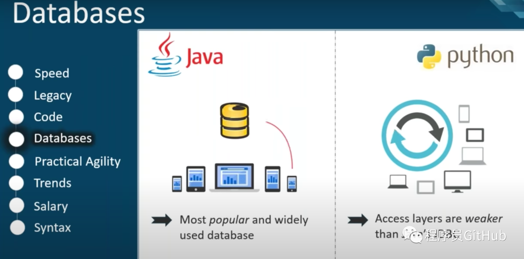 Java 跟数据库结合更紧密一些,有大量的数据库支持 Java,类似 JDBC、MyBatis 这样的封装,使得的 Java 使用数据库更容易。