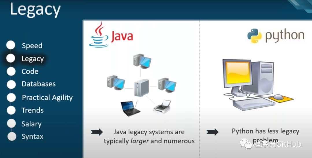对于 legacy 代码的支持,由于 Java 大量的用于电商,互联网后端,银行等大型系统,所以对于 legacy 的代码的数量要远大于 Python。