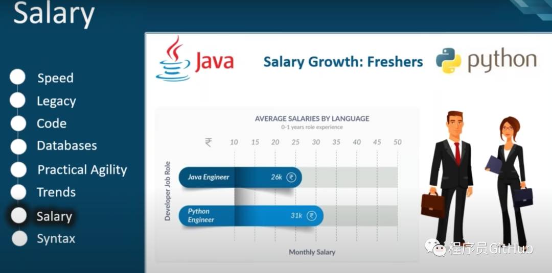 月薪收入 Python 略胜一筹,主要是因为人工智能太火了,起步价都在 30k 左右,所以应届生的薪资要高于 Java。