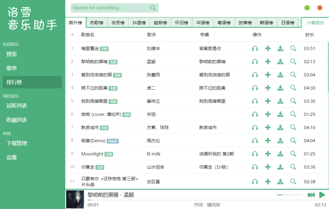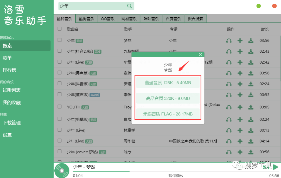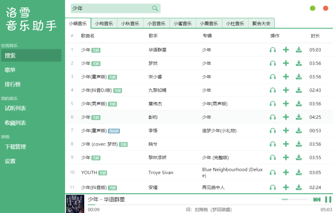 洛雪音乐助手是一款音乐聚合软件,同时支持酷我音乐、酷狗音乐、QQ音乐、网易云音乐、百度音乐、咪咕音乐等等平台的音乐 。而且支持在线试听、歌词适配、收藏和下载功能 。