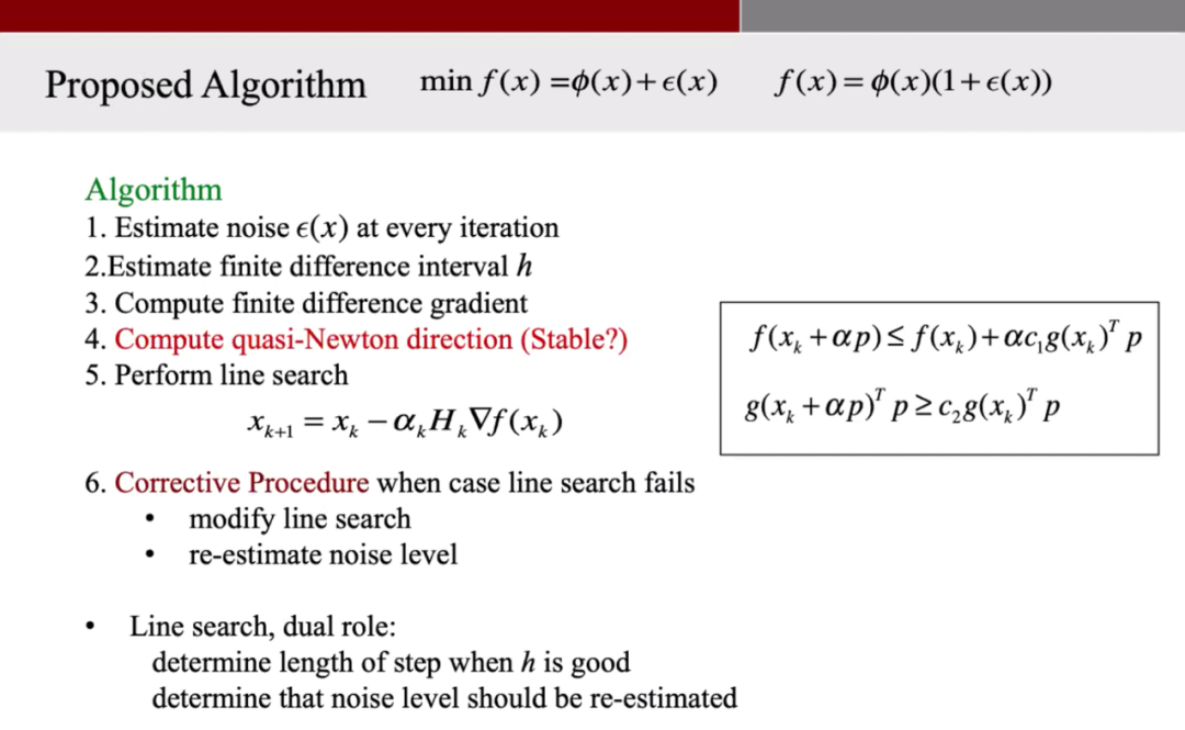 因此,在我们的算法中,我们将在每次计算中都对噪声进行估计,并据此估计有限差分区间。然后计算拟牛顿法的搜索方向并进行线搜索。当线搜索失败时,通过调整线搜索或是重新估计噪声水平进行更正。这里线搜索起到了 2 个作用:其一是在有限差分区间合适的情况下帮助决定步长,其二是帮助决定是否需要重新估计噪声水平。