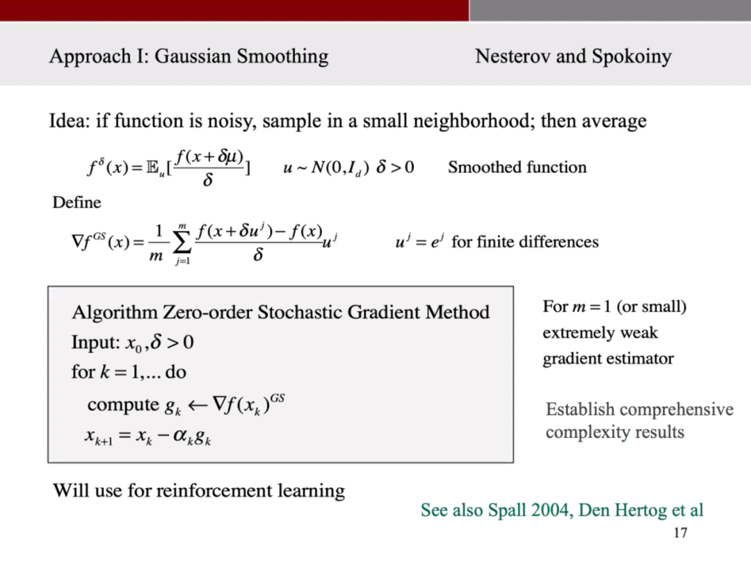 这里,我们需要考虑对带有噪声的函数的梯度进行估值。首先,我们可以对一个很近的区间范围内求平均,即从带有噪声的函数获得一个光滑的函数,然后求这个光滑函数的梯度。这个计算方法看起来像是有限差分,通过移动一段距离,用有限差分近似值乘以移动的方向,然后根据计算结果更新下一次计算,最后获得函数梯度的估值。