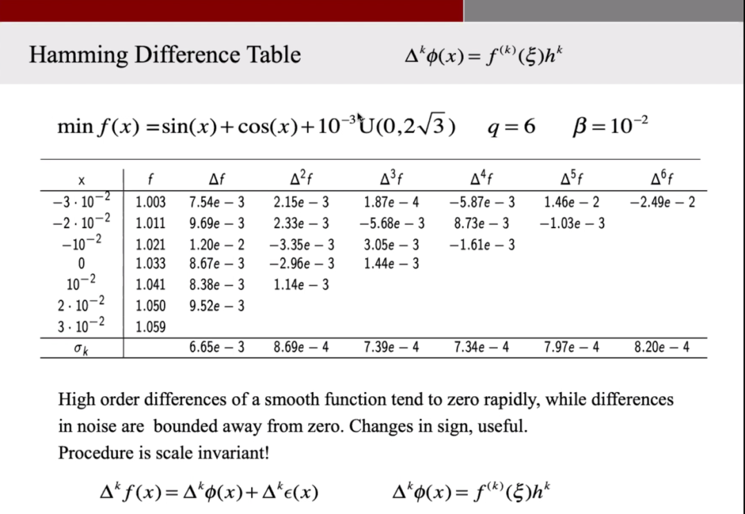 现在,我们获得了沿着这条线上几个点的函数估值,假设这里的我们计算了 7 个点,然后计算函数在这几个点之间的差,这会获得 6 个数值,我们继续重复这样的计算,并获得了如下图这样的表。对于光滑的函数来说,更高阶的差分会逐渐趋向于 0,而有噪声的函数则会一直停留在某个值附近。我们可以据此来估计函数的噪声水平。
