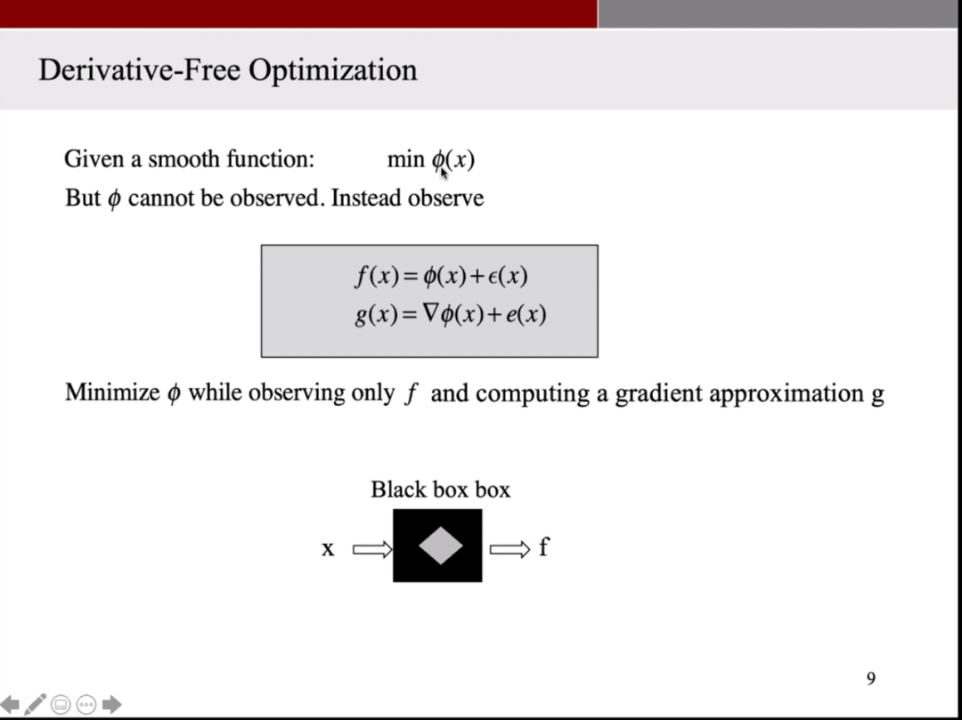 因此,那些“不怎么幸运”的情况下如何进行优化的问题就是此次 Jorge Nocedal 教授演讲的主题。具体来说,假设我们希望最小化一个非线性函数,这个函数需要是光滑的(但并不需要是凸的),我们可以获得函数的估值但不知道它的梯度,同时,函数估值包含了噪声,那么,对一个有着上千个变量的这样的函数来说,是否存在一种算法能够很好的处理这类函数的优化问题?