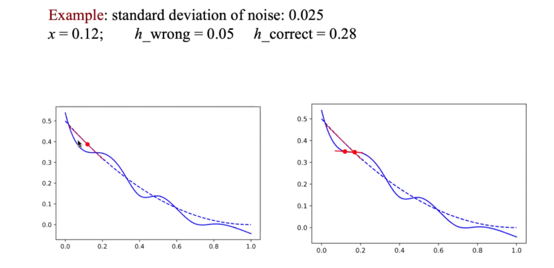 因此,我们需要估计函数的噪声水平,这就涉及到如何选取有限差分区间。如果我们选择了过小的有限差分区间,这个函数与真实函数的斜率将不匹配,如下图所示。但如果我们选择了 0.28 作为有限差分区间,我们将获得一个很合理的近似函数。所以这部分需要我们不断努力,选择一个随机方向,获得函数在沿着这个方向上的等距点上的估值。