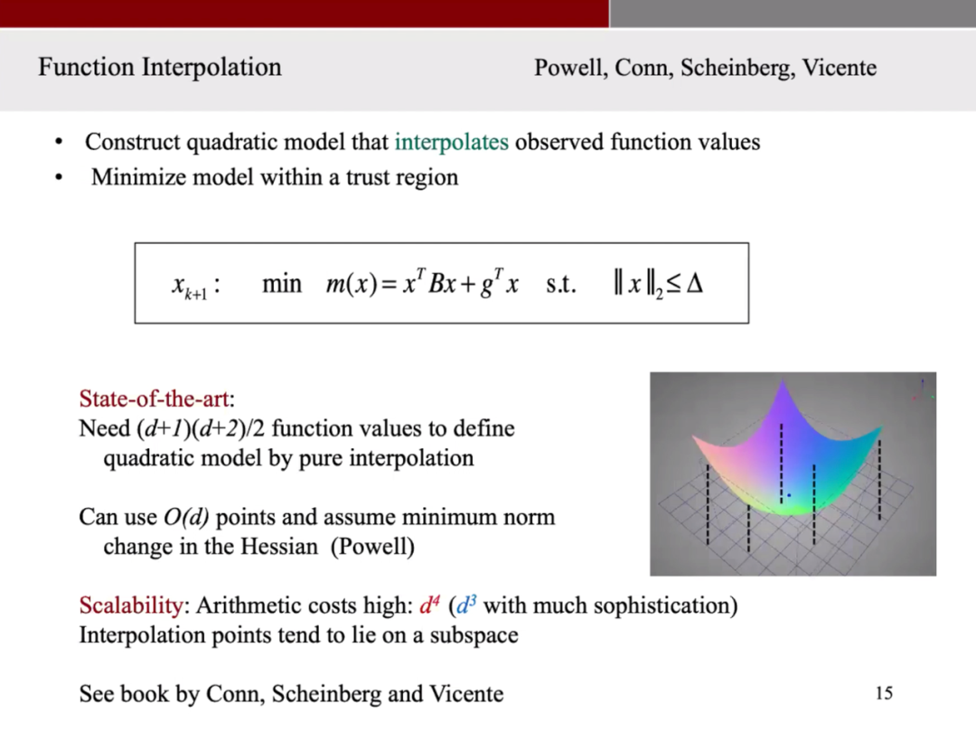 我们需要一个完整的 Hessian 矩阵以创建这样的二次模型,不过,我们可以在二次模型中插值,这就可以减少我们需要的信息量,然后将模型最小化至置信域。